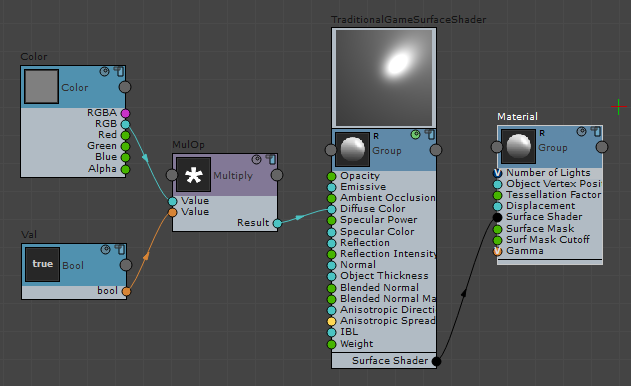 Um exemplo de aplicação usando os Nós de gráfico é ativar ou desativar a opacidade. Uma vez que é mais caro renderizar um sombreador com opacidade do que sem, um artista pode adicionar um interruptor para facilmente ativar ou desativar esta configuração para uma visualização mais rápida dos resultados de renderização.