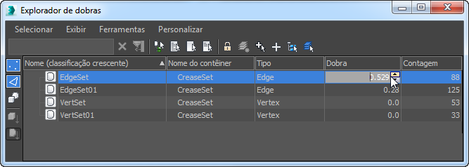 A Dobra Explorer fornece uma interface semelhante a uma planilha para gerenciar conjuntos de dobra nos modificadores CreaseSet e Dobra.