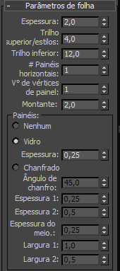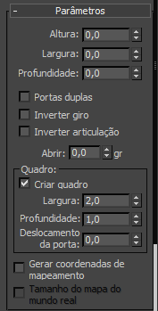 Esse grupo tem controles para a estrutura de porta-batente. Apesar de parte do objeto da porta, o quadro se comporta como se fosse uma parte da parede. Ela não se move quando você abre ou fecha a porta.