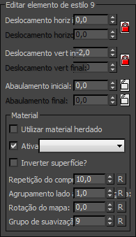 [bloquear Abaulamento inicial/final] Clique para bloquear ou desbloquear os valores Inicial e Final. Quando o valor de Abaulamento inicial ou de Abaulamento final estiver bloqueado, a alteração do Deslocamento vertical não afeta esse valor; caso contrário, afetará. Padrão = desbloqueado. Ativar isso desativa as outras configurações no Grupo de material, exceto por Grupo de suavização.