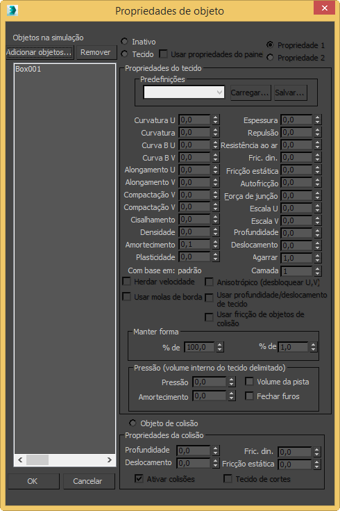 Use a caixa de diálogo Propriedades do objeto para especificar quais objetos são incluídos em uma simulação de Tecido, se eles são objetos de tecido ou de colisão e para definir os parâmetros associados a eles.