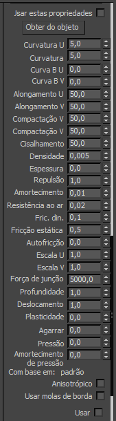 Os controles de Propriedades restantes são os mesmos encontrados no grupo Propriedades de tecido da caixa de diálogo Propriedades de objeto para Tecido.