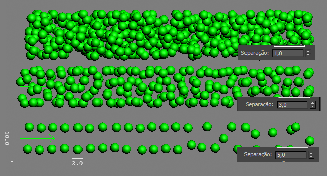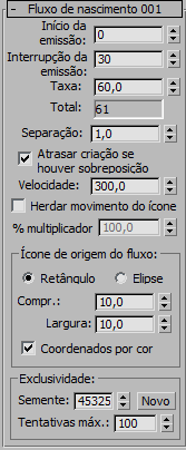 A configuração de Exclusividade determina a posição aleatória das novas partículas na superfície do ícone. Se uma nova posição não satisfizer à condição de separação, o fluxo de partículas rejeitará o posicionamento e tentará outro.