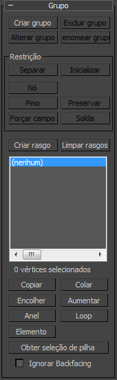 - Obtém uma seleção de subobjeto da parte de baixo do modificador mCloth na pilha e a aplica à seleção de vértice Grupo. Por exemplo, se você criar um objeto de Polígono editável, crie uma seleção de subobjeto de vértice para o objeto de Polígono editável, aplique o modificador mCloth e, em seguida, no nível do Grupo, clique em Obter seleção de pilha, a seleção de vértice é idêntica à feita para o objeto de Polígono editável.