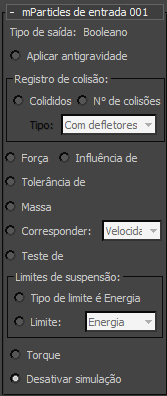 O suboperador mParticles de entrada destina-se a ler dados a partir do mecanismo MassFX ao criar operadores Fluxo de partículas. Esse recurso deve ser usado com os Operadores de dados.