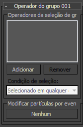 O operador de grupo aplica um evento inteiro às partículas especificada por um ou mais operadores Seleção de grupo. O Operador de grupo é útil para aplicar um evento a um subconjunto de partículas, mas sem dividir as partículas do evento atual. Ele somente afeta as partículas selecionadas enquanto elas permanecem no evento atual.