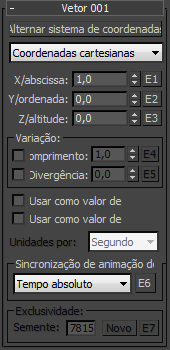 - Estão disponíveis somente com Coordenadas cartesianas, polares cilíndricas e polares esféricas; ou seja, opções que criam um vetor no espaço 3D. O valor de Comprimento especifica a máxima variação em comprimento para o valor do vetor gerado. A Divergência especifica a variação máxima na direção (desvio) do valor do vetor gerado, em graus.