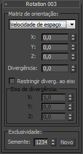 Use as configurações X/Y/Z para especificar a orientação para todas as partículas. O configuração Divergência não está disponível ao usar Seguir espaço de velocidade.