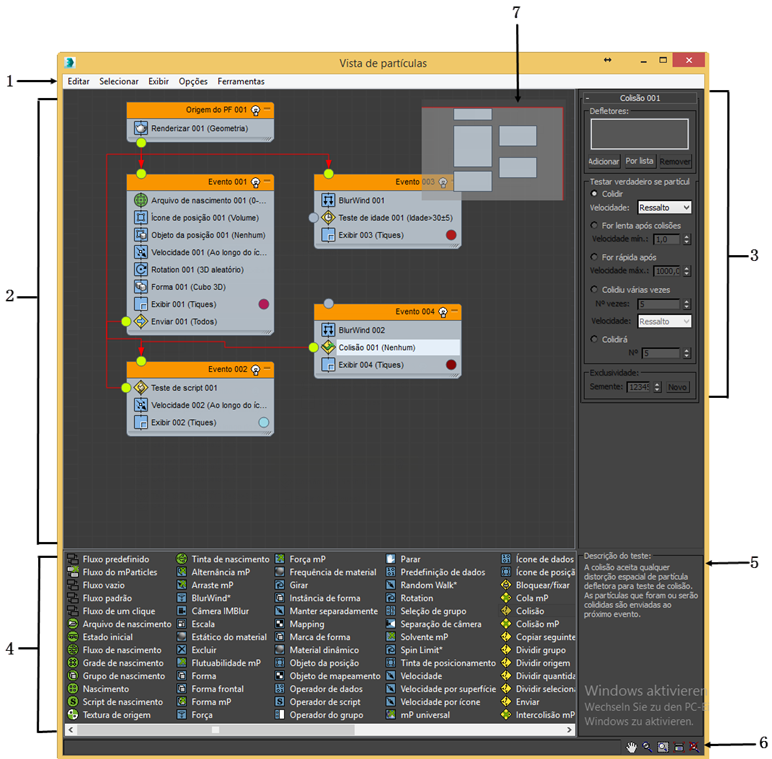 Por padrão, o nome de cada operador e teste em um evento é seguido da respectiva configuração ou configurações mais importantes entre parênteses. Uma barra de menus é exibida acima do evento e abaixo dele está o depósito, que contém todas as ações disponíveis para uso no sistema de partículas, bem como uma seleção dos sistemas de partículas padrão.