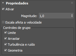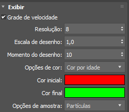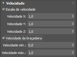 - Ativa a escala de velocidade que controla os fatores de escala aplicados aos componentes X, Y e Z das velocidades das partículas. Valores superiores a 1.0, podem, eventualmente, resultar em velocidades muito altas. Por isso, talvez seja preciso fixar as velocidades ao usar as escalas de velocidade.