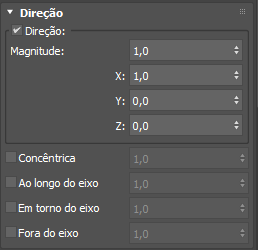 - Define, em m/s2, a aceleração ao longo do vetor de Direção. Pode-se definir esse valor como 0, para desativar a força direcional principal, e continuar usando as outras opções para controlar a aceleração em outras direções. Use magnitudes negativas para inverter a direção.