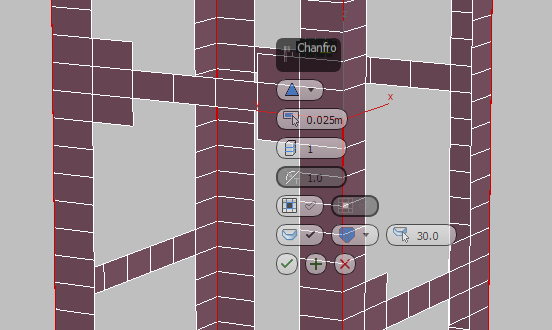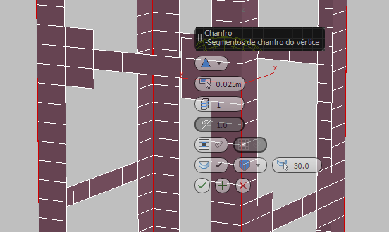 3ds Max Exibe os controles do Caddy para a ferramenta Chamfer.