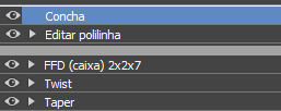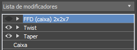 - Na Pilha de modificadores, ative os três modificadores desativados anteriormente: FFD, Giro e Conicidade.