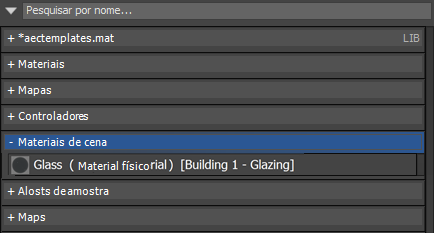 O 3ds Max aplica o material de vidraça à vidraça. Na seção Materiais da cena do painel Navegador, você agora poderá ver uma entrada Vidro e o nome do objeto.