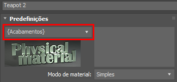Agora, o Bule tem cor, e seu exterior é do tipo não reflexivo. Ajuste as outras configurações como preferir, nas opções de Material físico. Você pode experimentar várias possibilidades, como tornar o bule transparente ou metálico.