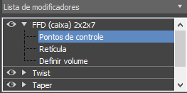 - Na pilha modificadora, clique no ícone de seta para expandir a hierarquia do modificador de FFD (caixa). Clique para selecionar os Pontos de controle.