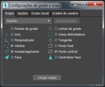 - No painel Snaps, clique em Apagar tudo e, em seguida, ative o Vértice, Borda/ Segmento e o Ponto central.