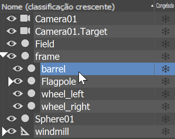 Após um momento, aparece uma dica de ferramenta que diz quadro, o que indica que a ferramenta de seleção está passando sobre o objeto de quadro. Nesta cena, o quadro é o objeto pai do canhão, significando que, se o quadro se mover, o resto do conjunto do canhão move com ele.