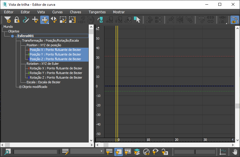 O 3ds Max abre o Editor de Curva. As trilhas que você acabou de criar para a bola devem estar visíveis à esquerda e as curvas devem aparecer na janela de curva à direita.