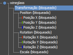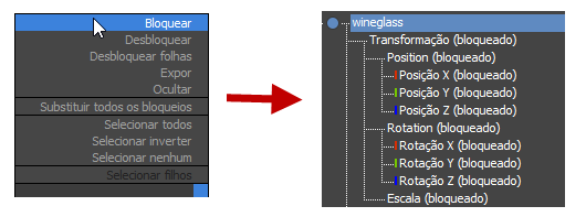 Com Todos desbloqueados ativado, pode-se utilizar os quatro botões de ícone na parte inferior da caixa de expansão Regras para rapidamente bloquear todos os modificadores, materiais, transformações e objetos, e também é possível utilizar o botão Editar para bloquear trilhas específicas, como antes. Para fins de conveniência, este exercício usa apenas as trilhas de transformação bloqueadas para a taça de vinho.
