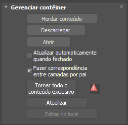 O botão Abrir está disponível, mas ao tentar utilizá-lo, o sistema emite uma mensagem informando que você está editando a definição do container em uma outra instância do 3ds Max.