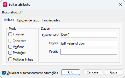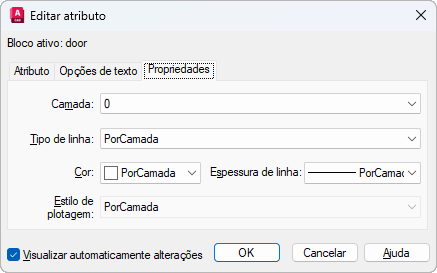 Controla se a área de desenho será imediatamente atualizada para exibir as alterações de atributo visíveis realizadas. Se Visualizar previamente automaticamente as alterações estiver selecionado, as alterações serão imediatamente visíveis. Se Visualizar previamente automaticamente as alterações estiver desmarcado, as alterações não serão visualizadas imediatamente.