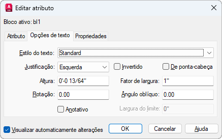 Configura as propriedades que definem a forma como o texto de um atributo é exibido no desenho. Altere a cor do texto do atributo na guia Propriedades.