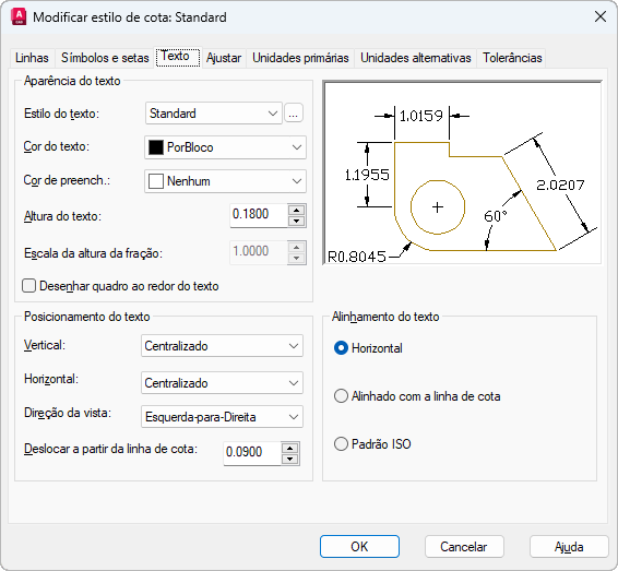 Se o estilo de texto especificado nesta guia tiver uma altura fixa, a altura substituirá a altura do texto definida aqui. Se você deseja definir a altura do texto de cota, certifique-se de que a altura do estilo de texto é definida como 0. Consulte o comando ESTILO para obter informações sobre a configuração de altura de texto para estilos de texto.