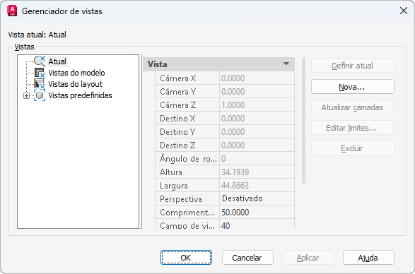 • Atual. Exibe a vista atual e suas propriedades de vista e corte