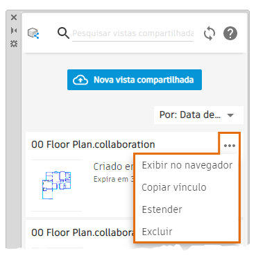 A paleta Vistas compartilhadas fornece uma forma de exibir vistas compartilhadas de um desenho e de publicar e responder a comentários de colegas e clientes através de suas contas para Web e dispositivos móveis da Autodesk.
