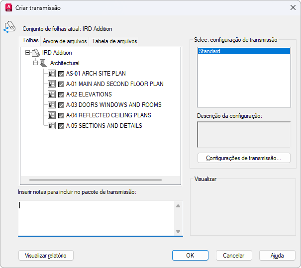 Exibe informações de relatório incluídas no pacote de transmissão. Inclui anotações sobre transmissão inseridas e anotações sobre distribuição geradas automaticamente que apresentam detalhes das etapas a serem seguidas para o correto funcionamento do pacote de transmissão. Por exemplo, se as fontes SHX são detectadas em um dos desenhos de transmissão, você será instruído sobre onde copiar estes arquivos para que eles possam ser detectados no sistema onde o pacote de transmissão está sendo instalado. Se você criou um arquivo de texto com anotações padrão, elas também serão incluídas no relatório.