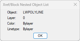 Exibe o tipo, o nome de bloco, o nome de camada, a cor e o tipo de linha de um objeto aninhado em um bloco ou uma referência externa.