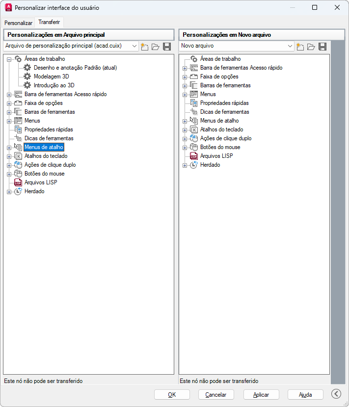 Quando você insere IMPORTARIUP no prompt do comando, o arquivo CUIx principal é exibido no painel direito (acad.cuix para arquivos do AutoCAD ou acadlt.cuix para arquivos do AutoCAD LT por padrão). Você abre um arquivo CUIx ou um arquivo de personalização herdado no painel esquerdo para transferir dados. Quando você insere EXPORTARIUP no prompt de comando, o arquivo CUIx principal é exibido no painel esquerdo. Você abre outro arquivo CUIx ou arquivo de personalização herdado no painel direito para transferir dados.
