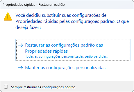 - Clique em Restaurar as configurações de propriedades rápidas padrão.
