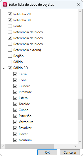 Se um tipo de objeto estiver marcado, as propriedades desse tipo de objeto são exibidas na paleta Propriedades rápidas quando um objeto do mesmo tipo estiver selecionado e quando QPMODE estiver definida como 2 e PICKFIRST estiver ativada. Limpe a marca de seleção junto a um tipo de objeto para remover o tipo de objeto selecionado da paleta Propriedades rápidas.