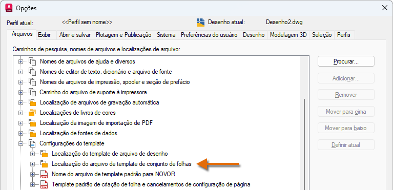 Os arquivos de modelo de desenho (DWT) são usados para criar novos desenhos. Os desenhos criados com um arquivo DWT contêm todos os estilos e objetos de desenho definidos no arquivo DWT. Os arquivos DWT personalizados da versão anterior são migrados para uma subpasta com o nome da versão para a qual eles foram migrados; a convenção de nomenclatura da subpasta é Modelos Nome do produto. A subpasta Modelos Nome do produto é criada na pasta definida pela configuração Localização do arquivo de modelo do desenho.
