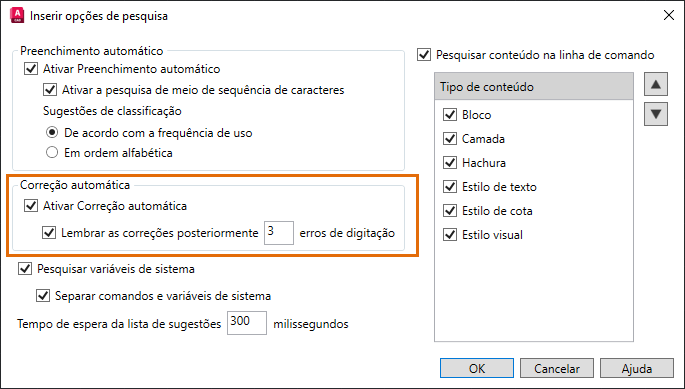 Se você costuma escrever certos comandos incorretamente, talvez queira tentar usar a Correção automática. Com o recurso Correção automática ativado, a lista de sugestões da linha de comando fornece sugestões com base em erros de ortografia que você cometeu no passado. Também é possível adicionar manualmente à lista Correção automática comandos e variáveis de sistema que você geralmente escreve incorretamente.