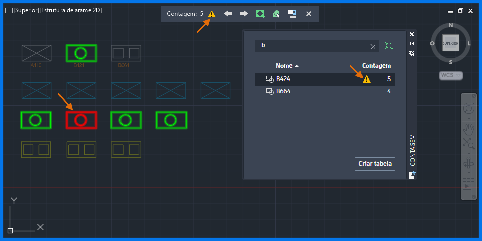 Os blocos B424 são realçados. Neste exemplo, você pode ver um ícone () exibido na paleta Contagem e na barra de ferramentas Contagem. A instância de bloco marcada com um erro é realçada em uma cor diferente (vermelho).
