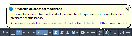 Dica: Quando, pelo menos, uma tabela em um desenho contém dados extraídos, o ícone Vínculos de dados é exibido na bandeja do sistema da janela do aplicativo do AutoCAD. Quando o ícone for exibido, você pode clicar com o botão direito do mouse nele para gerenciar e atualizar os vínculos de dados em um desenho. A variável de sistema DATALINKNOTIFY controla a aparência e a funcionalidade do ícone Vínculos de dados.