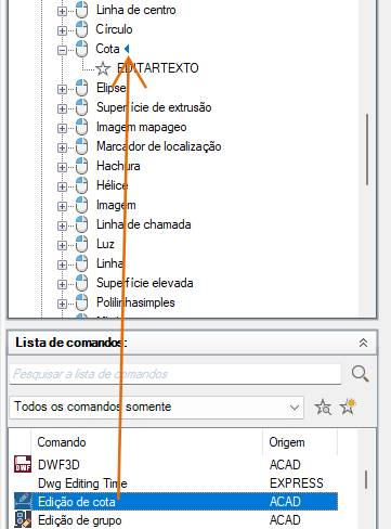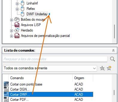 - Se você deseja substituir o comando atual atribuído a uma ação de clique duplo, arraste um comando do painel Lista de comandos para a ação de clique duplo no painel Personalizações em <nome do arquivo>.