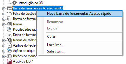 - Na guia Personalizar, no painel Personalizações em <nome do arquivo>, clique com o botão direito do mouse no nó Barras de ferramentas de acesso rápido. Clique em Nova barra de ferramentas de acesso rápido.