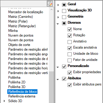 - No painel Objetos, selecione Referência de bloco na lista Tipos de objetos.