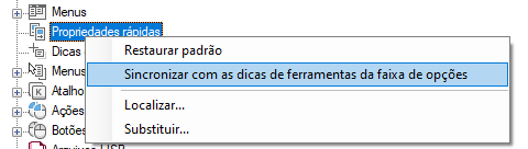 - Na guia Personalizar interface do usuário, no painel Personalizações em <nome do arquivo>, selecione Propriedades rápidas.
