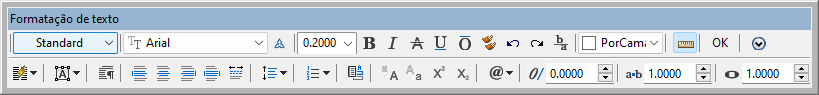 A barra de ferramentas Formatação de texto é exibida sempre que você cria ou edita um objeto TextoM. Essa barra de ferramentas não está disponível para texto de linha única.