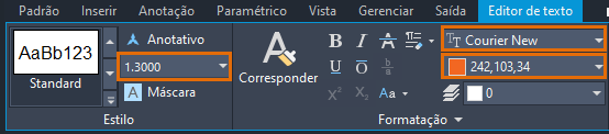 Na guia contextual da faixa de opções Editor de texto, faça o seguinte para alterar a formatação dos caracteres no TextoM: