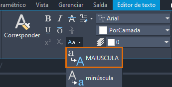 Na guia contextual da faixa de opções Editor de texto, painel Formatação, clique em Maiúsculas e minúsculas. Selecione MAIÚSCULAS.