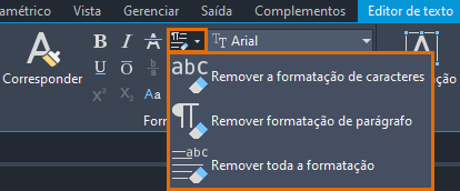 Na guia contextual da faixa de opções Editor de texto, painel Formatação, clique em Limpar e escolha entre as opções disponíveis: