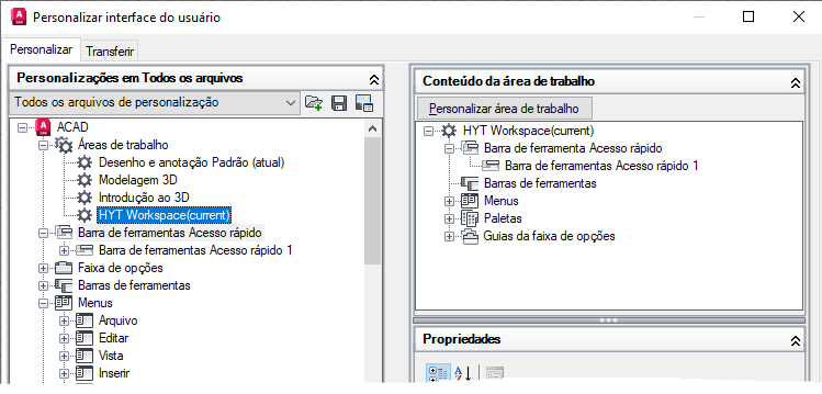 O espaço de trabalho HYT é definido como atual; a janela Paletas de ferramentas é exibida novamente.