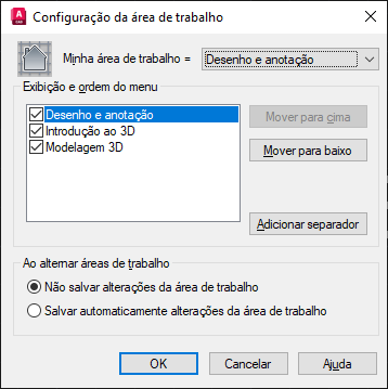 Um espaço de trabalho é usado para armazenar o estado atual da interface do usuário do AutoCAD.