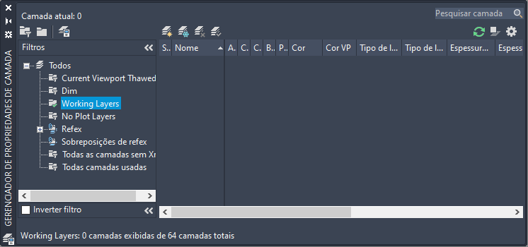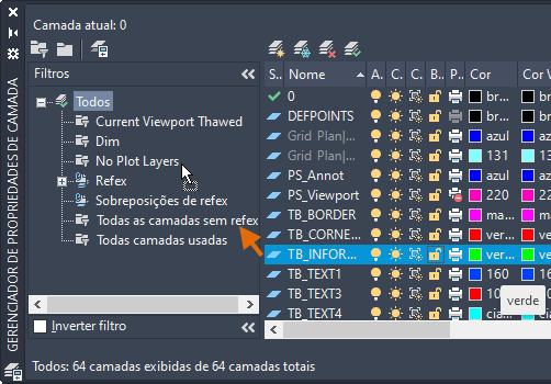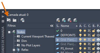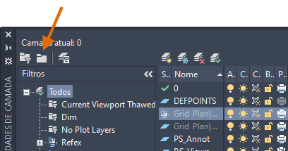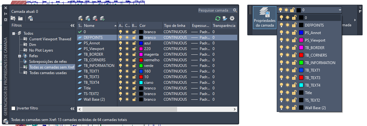 Para especificar quais camadas são listadas, é possível criar filtros de camada. Por exemplo, é possível definir um filtro de camada para excluir todas as camadas associadas às refexs anexadas das listadas no Gerenciador de propriedades de camada e na lista suspensa Camada.